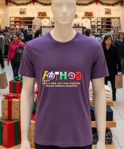 Just last week, as the buzz around San Antonio’s “Modern Marchesa” exhibit at the McNay Art Museum started peaking, a local fashion influencer I follow, ‘FiestaFitFam,’ shared a story on Instagram. She was talking about “dopamine dressing” – wearing clothes that genuinely boost your mood – and showed off a custom graphic tee her husband loved. It got me thinking about my own dad, and then, bingo! The “Fathor Like A Dad Just Way Mightier Shirt” popped into my feed. It wasn’t about high fashion runways, but about that deep, everyday connection. With Father’s Day around the corner, and the city gearing up for casual summer gatherings, from backyard barbecues to evenings on the Riverwalk, this tee felt like the perfect statement. San Antonio’s fashion scene, while embracing haute couture and sustainability in style, also cherishes comfort and personal expression. This shirt, with its playful yet powerful message, felt like it fit right into that vibe – a little bit of streetwear chic mixed with heartfelt sentiment. It’s for every son or daughter wanting to celebrate their dad, for every wife who sees her husband as the family superhero, or for any dad who simply feels mightier. It’s for those moments when you’re grabbing a breakfast taco, watching the Spurs game, or just kicking back, and you want to wear your pride. This isn’t just a shirt; it’s an ode to the man who truly is mightier.