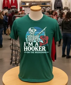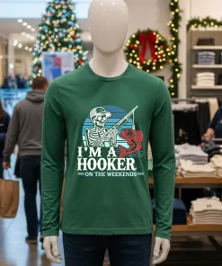 What truly sets this shirt apart, though, is its clever design. The skeleton, casually casting a line, with that brilliant “I’m A Hooker On The Weekends” text? It’s not just a funny pun; it’s a certified conversation starter. Imagine Mike, sporting this tee, getting a chuckle and a nod of understanding from fellow anglers – or even a curious smile from someone who gets the double entendre. It evokes a real sense of pride, a playful wink to those in the know, making you feel part of an exclusive, humorous club. This tee isn’t just worn; it’s wielded. To keep that skeleton looking sharp and that witty text vibrant, a simple wash is all it takes: cold water, inside out, and a gentle tumble dry. It’s more than fabric; it’s your weekend companion, a symbol of your escape, a statement piece that says, “I work hard, but I play harder.”