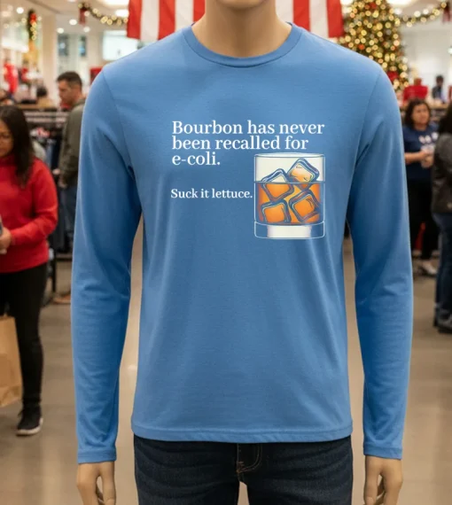 Remember that time whole grocery store aisles were cleared because of another E. coli scare with, yep, lettuce? It feels like it happens every few months, doesn’t it? Well, imagine you’re at the San Antonio BBQ Cook-off, the air thick with mesquite smoke and the sounds of Tejano music blending with live blues. Folks are dressed in everything from classic cowboy boots to cutting-edge street style – because here in SA, our fashion scene is all about mixing tradition with modern flair. Think vintage rodeo chic meeting sustainable, comfort-first fits. You’re there, laughing with friends, enjoying a pulled pork sandwich, and someone across the picnic table is wearing that shirt. The one that declares, with perfect, sarcastic brilliance: “Bourbon Has Never Been Recalled For E Coli Suck It Lettuce Shirt.” Suddenly, the vibe shifts from just good food to outright hilarious commentary. It’s not just a shirt; it’s a conversation starter, a nod to shared exasperation with health advisories, and a wink to the enduring, comforting truth of a good ol’ glass of bourbon. This isn’t just about the drink; it’s about the irony, the freedom from worry, and frankly, a bit of cheeky rebellion. In a city like San Antonio, where personal expression and a laid-back, yet spirited, attitude are part of our DNA – from the vibrant Riverwalk fashion to the unique artisan markets – a tee like this just fits. It’s for the person who appreciates a good laugh, loves a casual, statement-making piece, and isn’t afraid to show off their wit. It’s perfect for casual Fridays, a Spurs game, or just chilling out on the patio, embodying that relaxed American style that’s always in vogue, especially when paired with some distressed denim or a cool utility jacket. It’s the kind of subtle sartorial statement that’s quietly taking over the ’20s fashion scene, blending humor with everyday wearability.