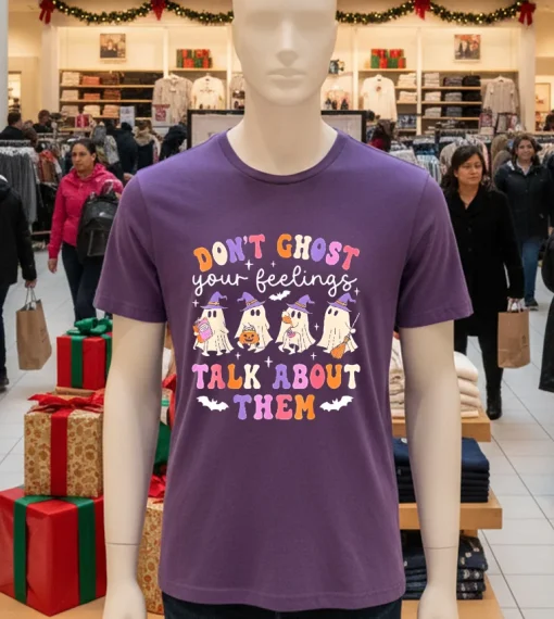 What truly sets this shirt apart isn’t just the spooky-cute vibe, but the incredibly clever phrase: ‘Don’t Ghost Your Feeling.’ It’s a subtle yet powerful design element. In a world where we often feel pressured to put on a brave face, this shirt is a gentle nudge to acknowledge what’s going on inside. It’s an advantage for the wearer because it silently communicates empathy and openness. Imagine wearing this and someone cracks a smile, or even better, starts a conversation about mental well-being. There’s a real sense of pride that comes with wearing something that not only looks good but also stands for something important. It’s like saying, ‘Hey, I’m here, I’m human, and it’s okay to feel.’ For me, slipping into a tee like this on a particularly hectic day feels like wrapping myself in a little bubble of self-acceptance. To keep that powerful message vibrant and the shirt feeling great, remember to wash it cold, inside out, and tumble dry low. This tee isn’t just an article of clothing; it’s a companion, a soft reminder to be kind to yourself and others, through all the Halloween fun and beyond. It becomes a necessary part of your wardrobe, a piece that truly resonates.