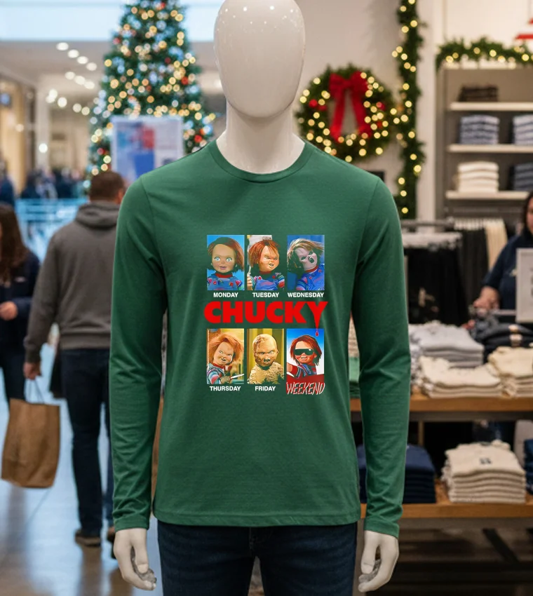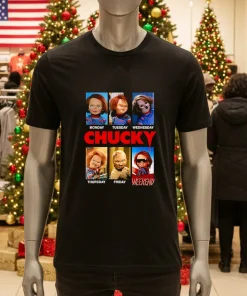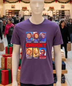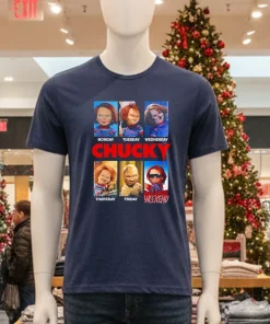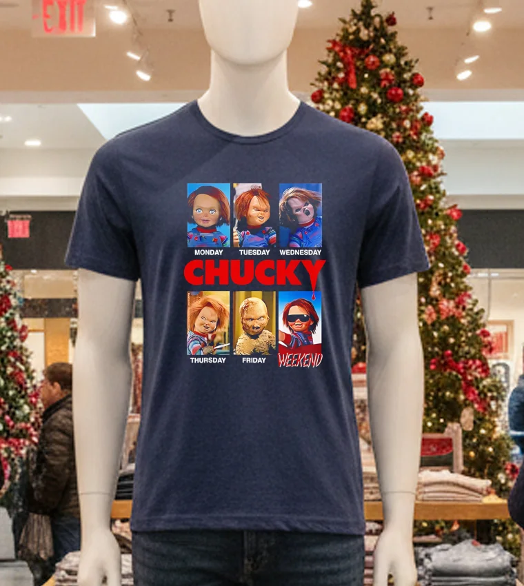 What truly sets this shirt apart is its ingenious design. It’s more than just a picture of Chucky; it’s the clever juxtaposition of the “Monday Tuesday Thursday Friday Weekend” text, transforming the notorious doll into an almost ironic symbol of our daily grind and subsequent escape. This graphic isn’t just printed; it feels integrated, like a piece of wearable art, designed to spark conversations. It’s for the person who owns their quirky tastes, wearing their humor and their love for cult classics with pride. To keep this masterpiece looking its best, always turn it inside out before washing in cold water, and air dry if you can. It’ll stay vibrant, feeling soft against your skin, and will be that reliable companion for countless casual adventures, always ready to tell your story without you saying a word.